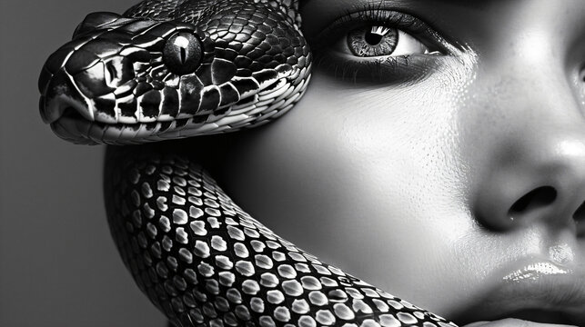 yellow python is moving tongue on hands of young pretty woman, closeup view, circus