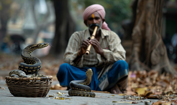 Snake charmer playing flute in outdoor setting with cobras in basket and on ground. Traditional Indian cultural practice. Street performance concept for design and print.