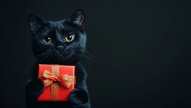 Black cat holding a red gift box.