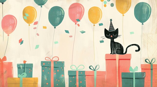 Happy black cat birthday celebration, pastel background