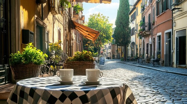 A charming outdoor Italian caf with checkered tablecloths, espresso cups, and a view of a cobblestone street.