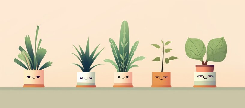 Cozy plant cartoon characters on plain background, Plants as cartoon in pots