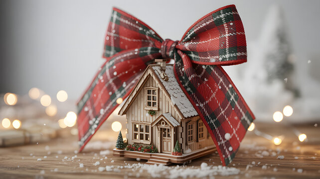 A charming miniature house adorned with a festive red plaid bow, nestled in a snowy setting with warm bokeh lights, evoking the cozy spirit of holiday celebrations and home gifting