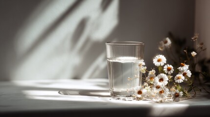 Sunlit glass of water with charming daisies, a refreshing and soothing vibe