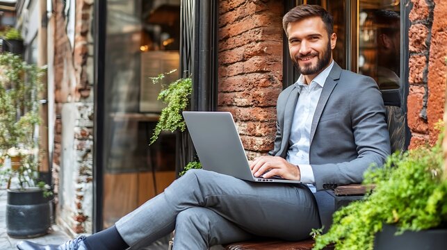 Smiling man wearing light blue shirt poses against a bright blue background, exuding a cheerful and friendly vibe with a charming expression. Portrait style.