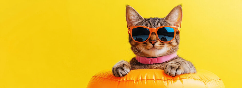 Cool Cat on Summer Vacation: A charming domestic cat, sporting stylish sunglasses and a life ring, radiates a carefree vibe against a vibrant yellow backdrop.