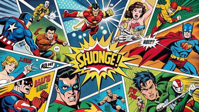 Colorful illustration of a classic comic book strip featuring action-packed scenes, vibrant characters, and dynamic speech bubbles against a bold, graphic background.