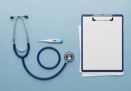 A blue stethoscope, digital thermometer, clipboard with blank paper, and medical tools arranged on a light blue background.