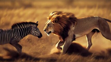 Lion chasing zebra in African savanna; wildlife hunt
