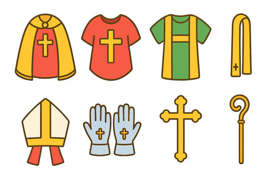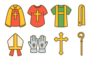 Children's Church Icon Set. Flat vector mini-illustrations Ceremonial vestments in colors children's illustrations: cope, chasuble