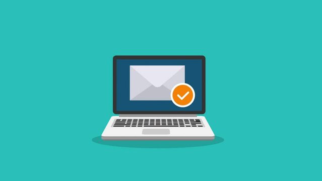 Animated laptop with email inbox, checking messages and managing communication in digital workspace