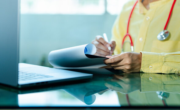 Close Up Of Asian Male Doctor With A Fat Male Patient In Clinic, Sitting At Desk, Discussing About The Results Of Medical Check Up On A Tablet, Giving Bad News, Encouraging A Patient