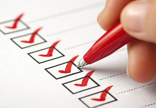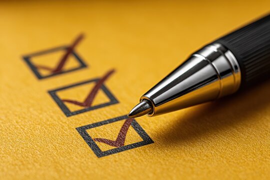 Completing a checklist with a pen on yellow paper, three items have already been checked