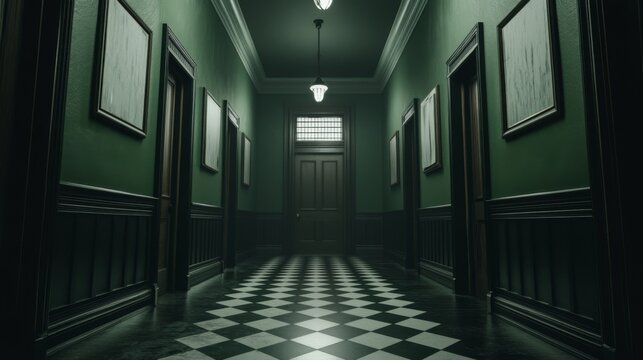 Elegant room with red curtains and checkered floor. The image showcases a luxurious interior with dramatic red curtains, dark marble walls, and a black and white checkered floor