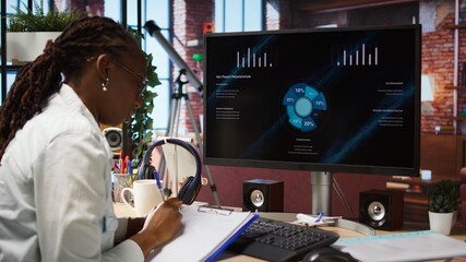 Remote worker at home watching business conference on PC monitor, looking over statistics on documents. Freelancer in apartment looking at presentation and checking paperwork files, camera A