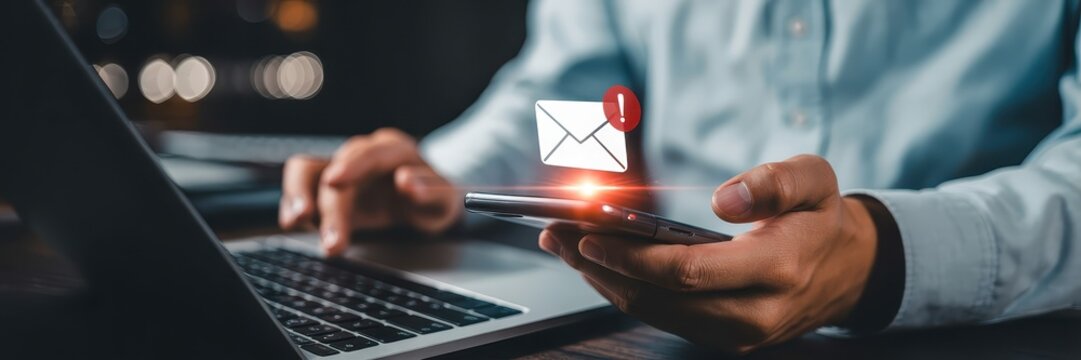 Person using a laptop and mobile phone, checking email notification.