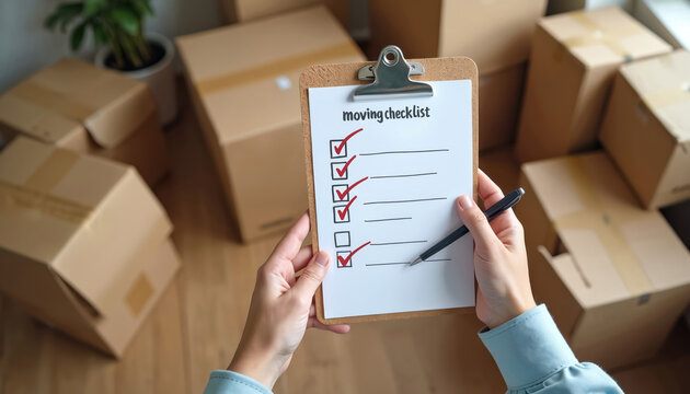 Person holds moving checklist with several marked items. Around are cardboard boxes. Packing supplies pen are present. Preparing relocating home or office. It is organized.