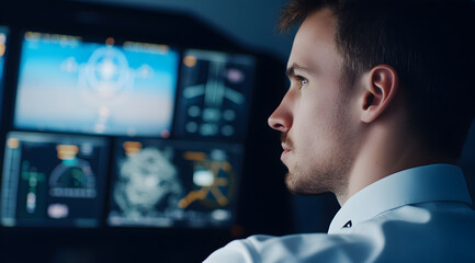 A focused pilot monitors cockpit instruments, showcasing the complexities of aviation technology and the professionalism required in flying.