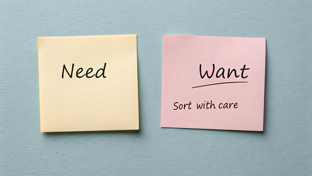 Two Sticky Notes Displaying Need and Want on Textured Surface