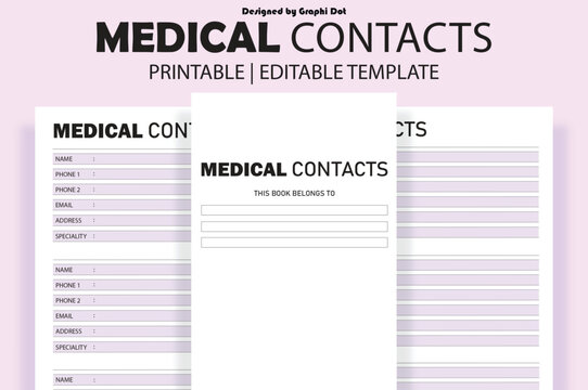 Medical Contacts List Template, Healthcare Contacts, Doctor Contacts, Health, Fitness, Wellness Printable
