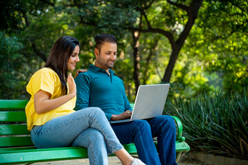Indian happy couple working on laptop and doing online payment at park. Concept internet banking