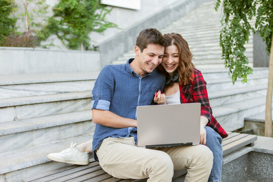 European man and woman partner online shopping buying goods in internet choosing searching use computer. Boyfriend and girlfriend looking hotel for summer travel vacation or house for rent together