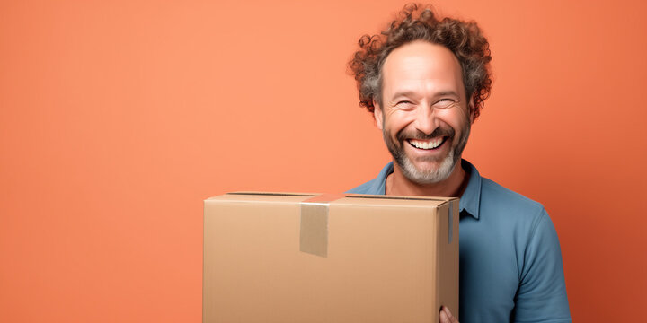 Delivery man holding a cardboard box smiling at the camera, courier with parcel near van, delivery service concept.