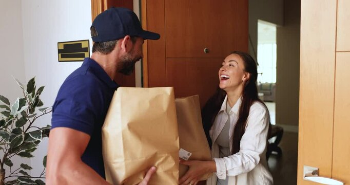 Happy courier man carrying paper packages to customers apartment door, giving grocery shopping bags to cheerful young woman. Positive recipient getting purchase from supermarket delivery service