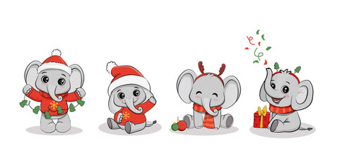set of Cute cartoon elephant cub isolated on white background. Christmas card with funny elephant and gift. Vector illustration