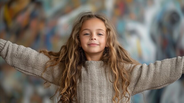 Smiling girl with open arms in front of colorful abstract background