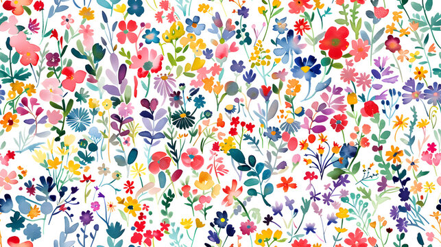 A whimsical seamless watercolor floral pattern showcasing a variety of blossoms and leaves in bright, cheerful colors, creating a lively and playful design.