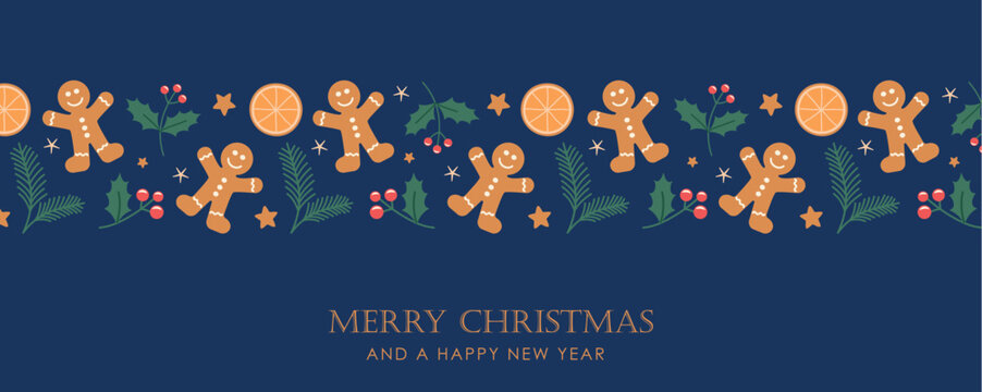 merry christmas card with gingerbread orange and fir twig decoration vector illustration