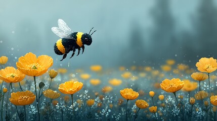 A vibrant illustration showcases a bumblebee in flight over a field of bright yellow poppies and tiny white flowers, creating a serene and colorful natural scene with a soft, blurred background and...