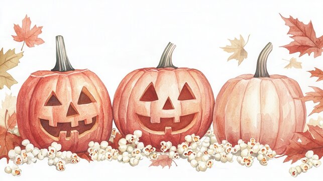 Halloween themed watercolor pumpkin and popcorn design concept. A whimsical illustration of three carved pumpkins surrounded by popcorn and autumn leaves capturing the festive spirit of Halloween