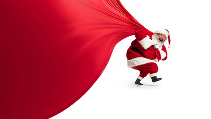 Santa Claus carrying giant bag of gifts, pulling heavy load with big smile, spreading luck and cheer isolated on white background. Christmas, New Year, 2024. Poster, postcard, banner, flyer template