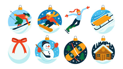 Winter's Festive Ornaments: A vibrant collection of Christmas ornaments, each adorned with dynamic winter sports scenes, cheerful snowman, and cozy winter cabin.