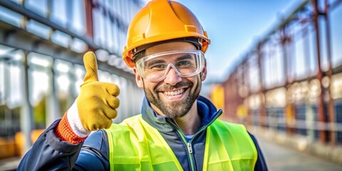 A cheerful worker in protective gear, including hard hat, safety glasses, gloves, and reflective vest, gives a confident thumbs up with a wide, joyful grin.