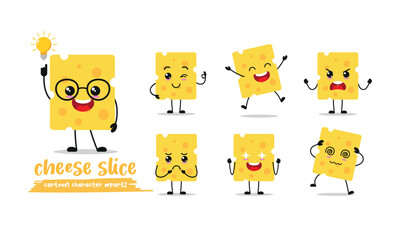 Cute cheese slice cartoon with many expressions. different cheese activity vector illustration flat design. funny cheese slice for children story book.