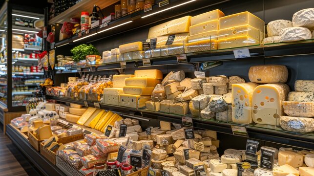 A friendly employee is at a cheese shop, actively showcasing a wide range of delicious cheese varieties on display