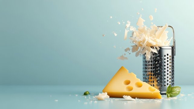 Stylized illustration of cheese grater and Parmesan wedge in bold lines.