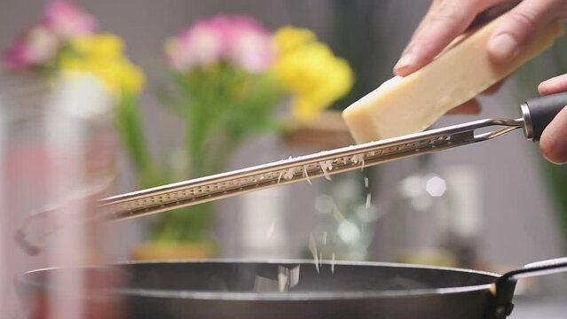 A man rubs cheese on a metal grater for freezing and further cooking pizza, pasta.