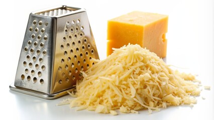 Shredded mozzarella cheese in a ceramic bowl, placed on a marble countertop with a cheese grater nearby, isolated on a pastel blue background
