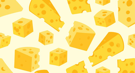 Fun and delicious seamless pattern featuring various types of yellow cheese wedges and cubes, creating a playful and appetizing food-themed background.