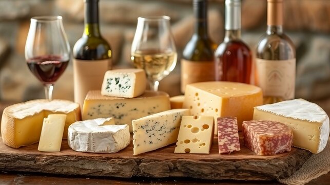 arranged wine and cheese pairing showcasing an array of artisanal cheeses and carefully curated wine selection, set against a rustic backdrop for an inviting ambiance