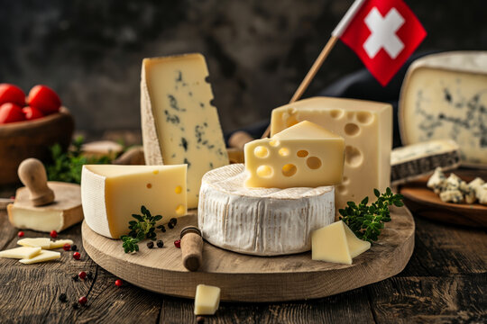 Table with board of various regional Swiss cheese and flag of Switzerland. Delicious looking cheeses on a wooden table.