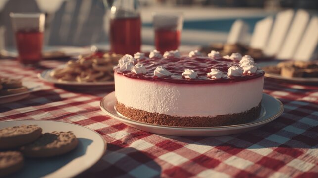 Delicious cheesecake on a picnic table with cookies and refreshing drinks during a sunny day by the poolside