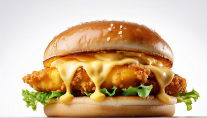 zinger burger with cheesy drizzle a close up of a zinger burger with melted cheese oozing over a crispy chicken patty with crisp lettuce and a golden bun on a clean white background
