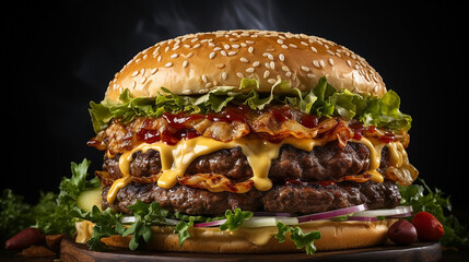 layered sliced tasty juicy double cheese burger with fresh lettuce, tomatoes, onions, pickles and melted cheese stacked high, gourmet fast food, restaurant menus, food