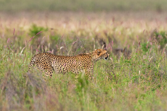 Cheetah, Acynonix Jubatus walking in tall savannah grass Voi, Tsavo, Kenya