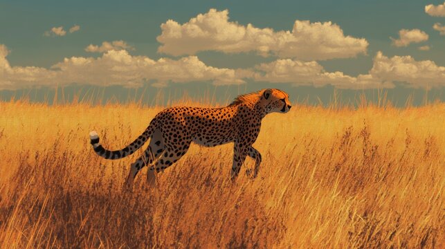 A serene image of a cheetah walking gracefully through tall golden grass in a vast savannah. The warm tones of the setting and the cheetah. AI Generation